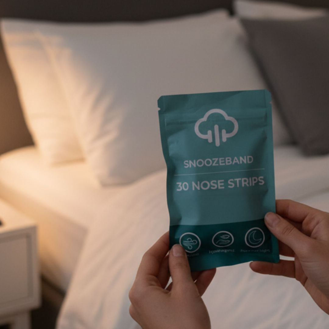 Snoozeband Nose Strips gently support nasal airflow throughout the night, helping reduce breathing resistance that can contribute to snoring and restless sleep.